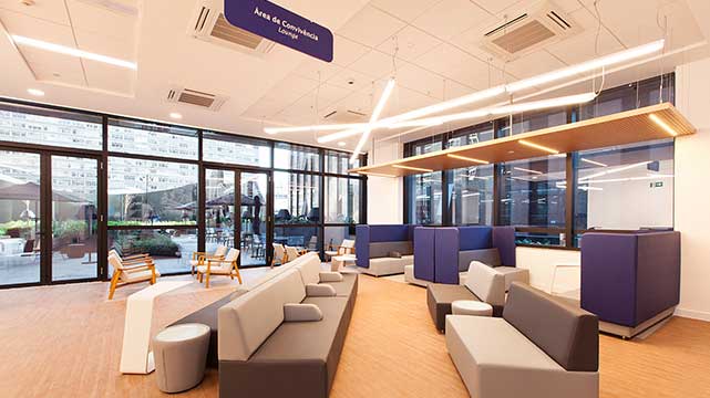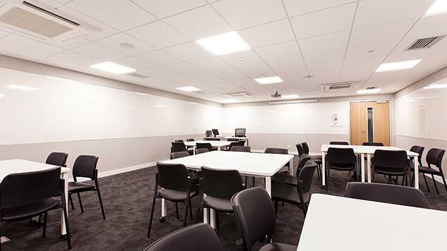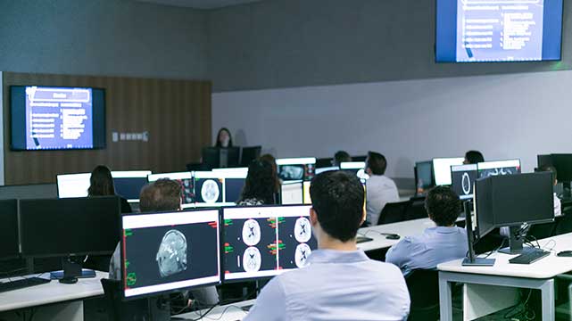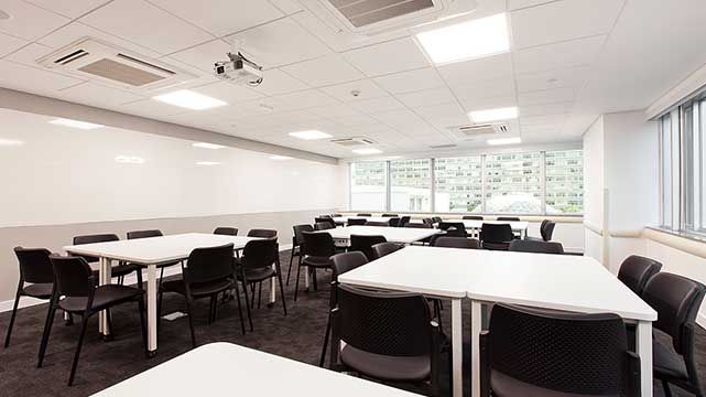 Salas de aulas equipadas com modernos recursos audiovisuais, desenhadas para facilitar a interação entre professores e estudantes e para possibilitar a aprendizagem por meio da utilização de diversificadas metodologias educacionais. Nas situações em que as turmas são divididas em grupos, a estrutura flexível das salas de aulas permite montagens facilitadoras para estratégias de trabalho com dinâmicas de grupos.